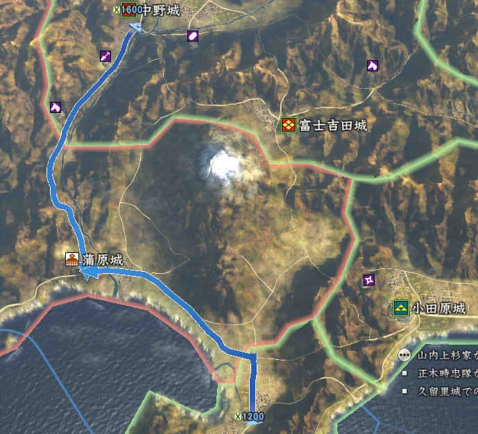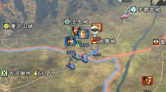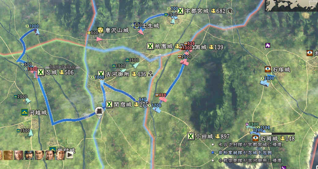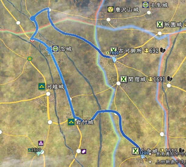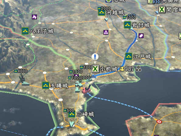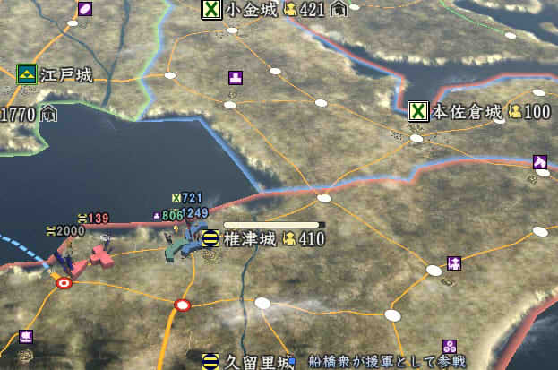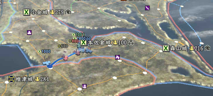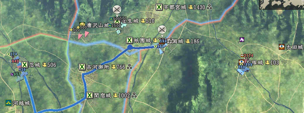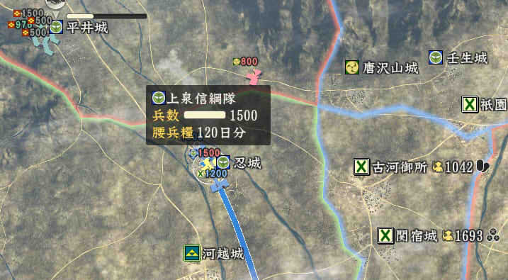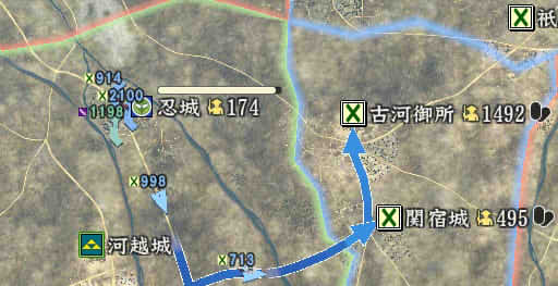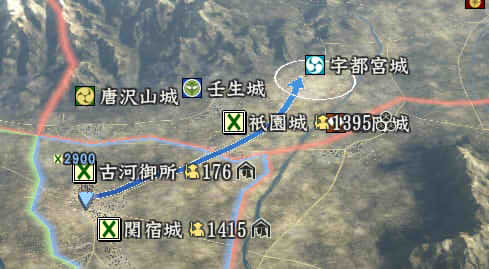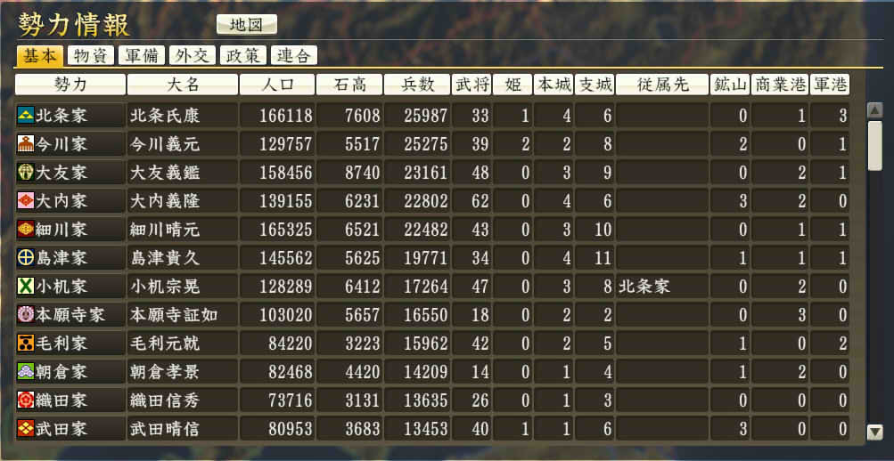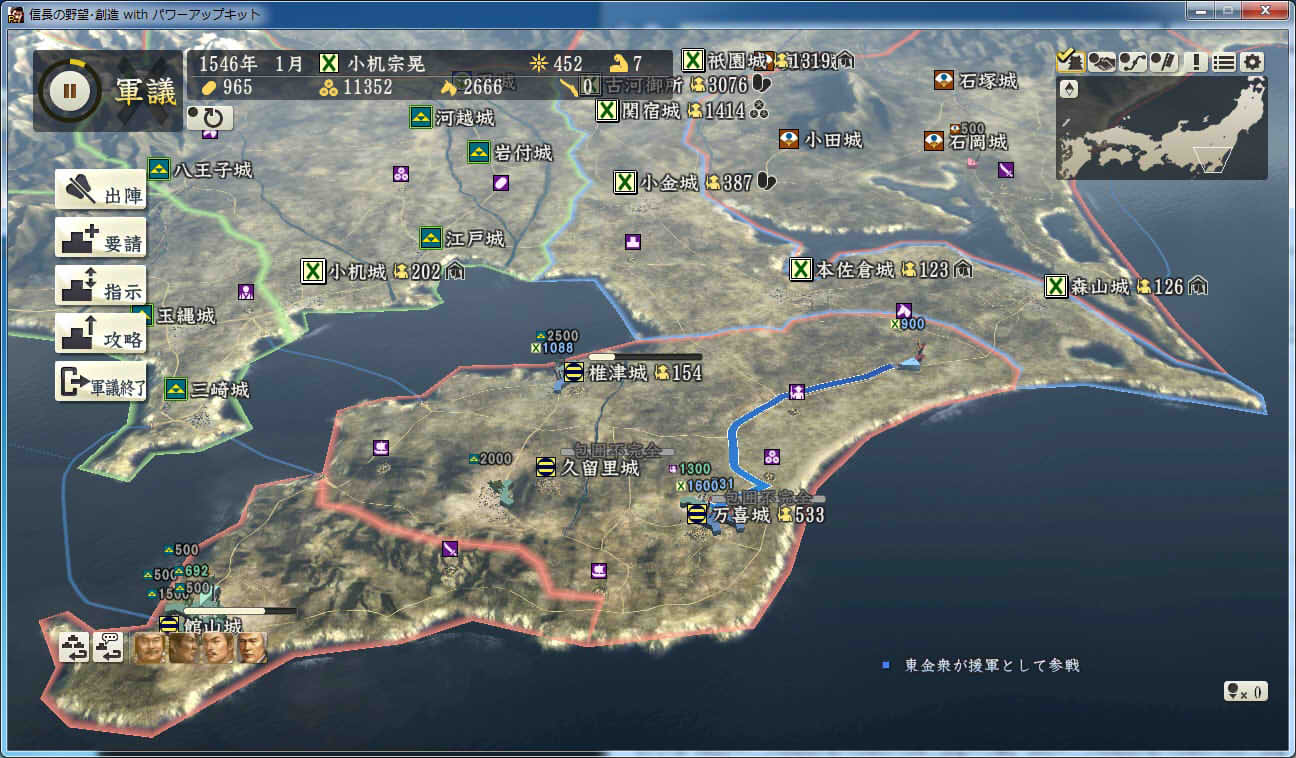信長の野望 創造PK 新勢力プレイ 小机家 その5 1546年11月 それなりに大きくなった小机家。今後の版図をどう広げるか。特に上洛ルート。 北条−武田−今川の同盟があと1ヶ月。 継続しようがばちばちやりあおうが、ここを抜くのは大変そう。 そうなると北陸道を経路にとらざるを得ない。 その橋頭堡は抱えておかないとなので、忍城と平井城を目標にする。 その後下野、常陸を接収して、対上杉にむけての国力をつけ・・・。 という皮算用がはたしてうまくいくか、、、 というわけで、本佐倉から平井城攻略部隊を出陣。 武将移動が終わったら翌月に忍へと出陣を狙う。 ありゃ武田が平井攻めしちゃった。 |