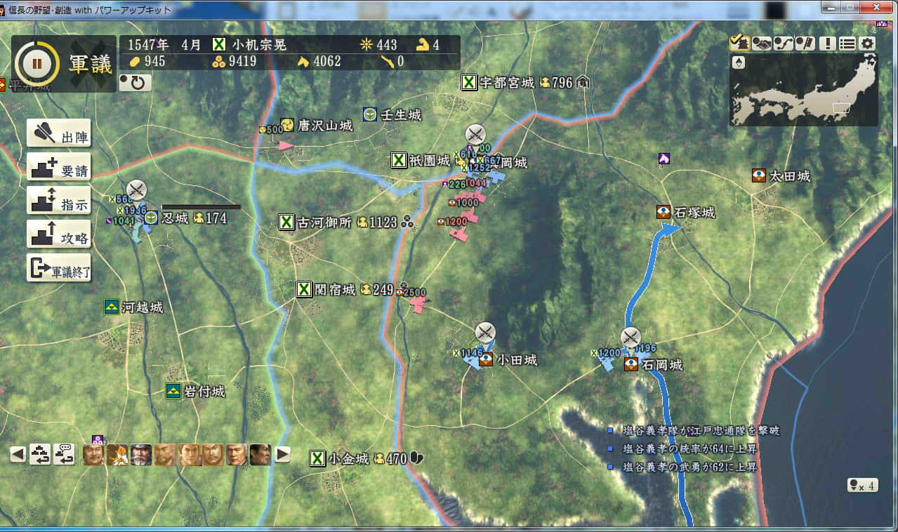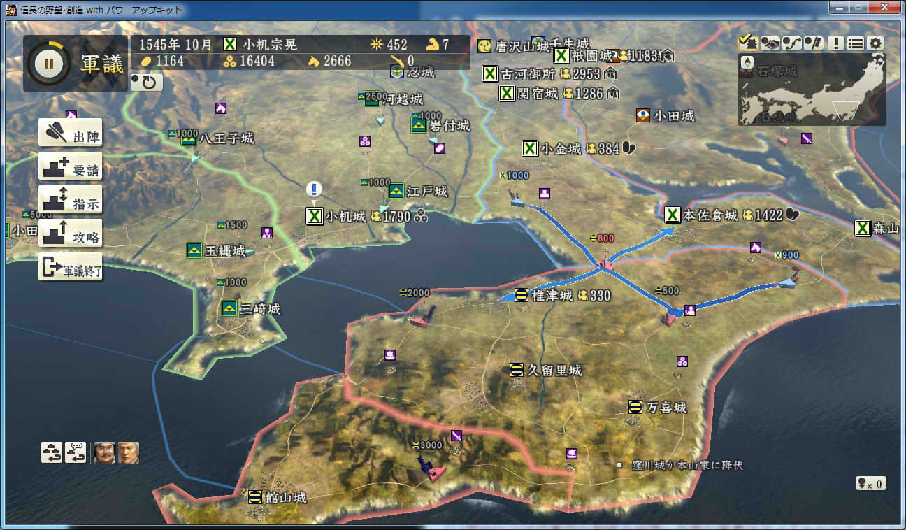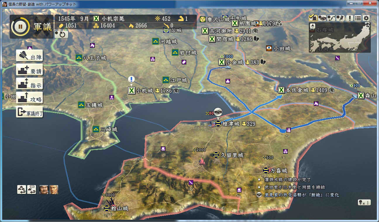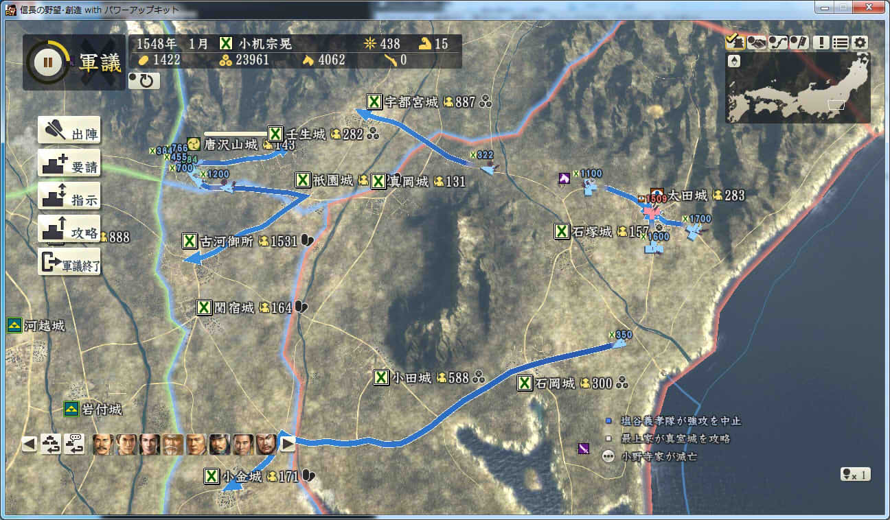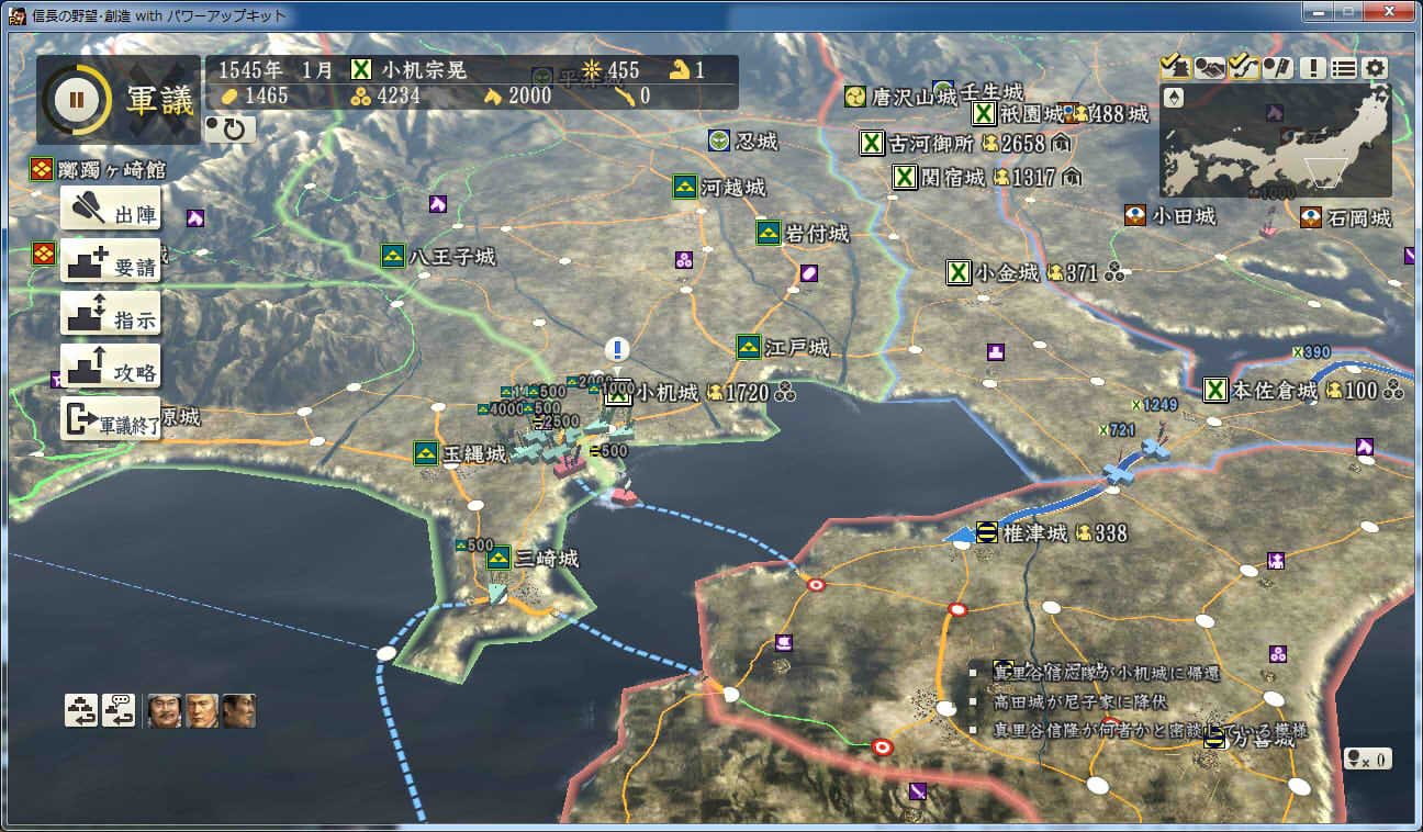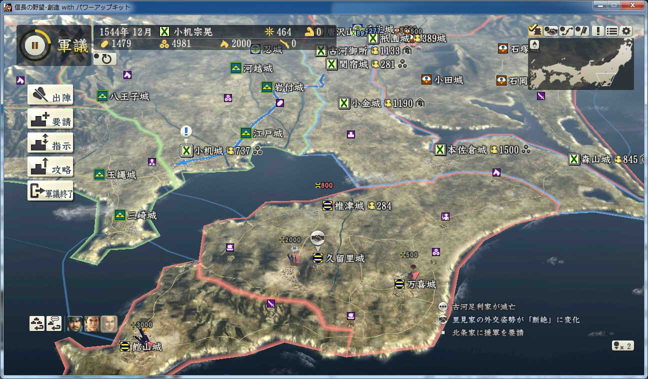 信長の野望 創造PK 新勢力プレイ 小机家 その3 1544年9月 肝付城の肝付家が島津家によって滅亡 下総の国人衆、飯櫃衆が服属 |