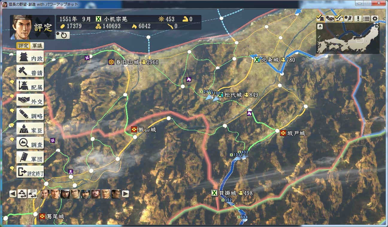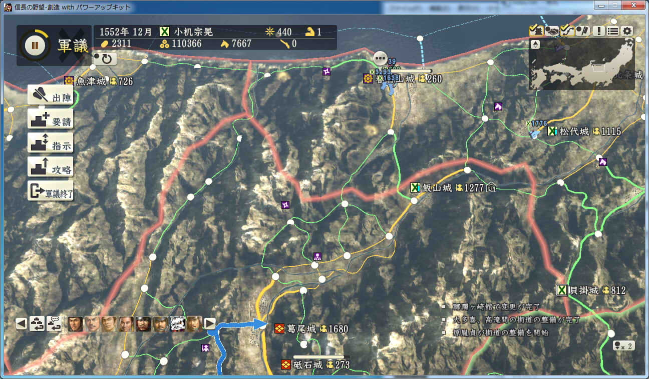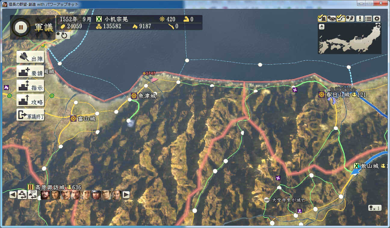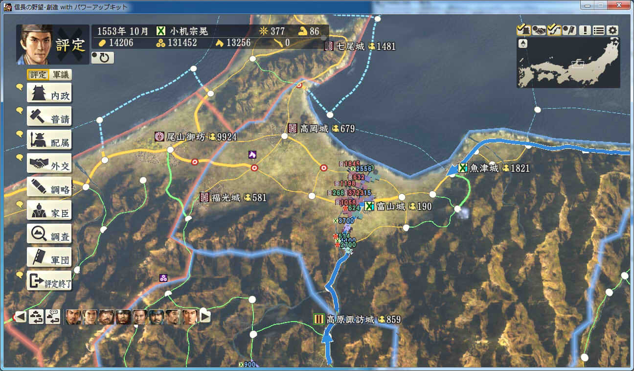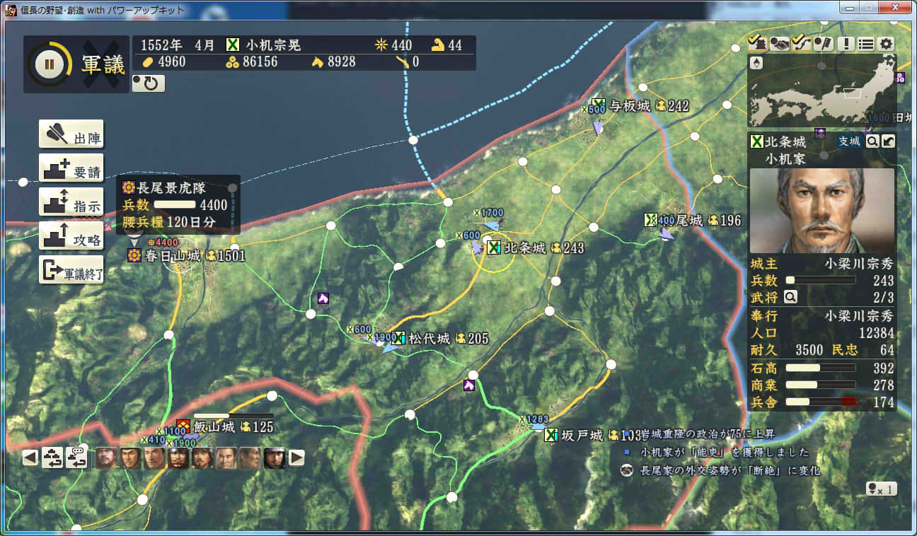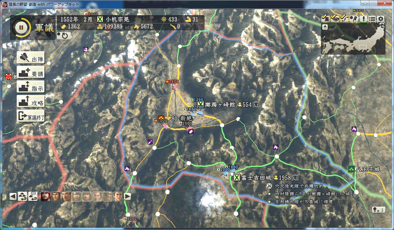 信長の野望 創造PK 新勢力プレイ 小机家 その9 北条領に進軍した武田軍。 これに黙っていないことにした小机家。 上杉牽制用に松代城に残した部隊を坂戸、飯山攻略に向かわせることに。 |