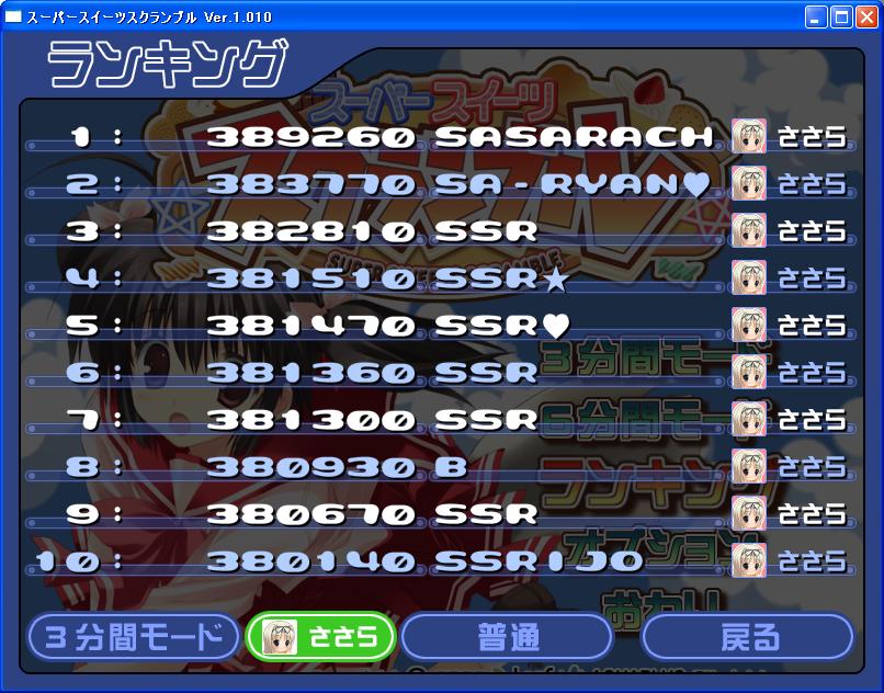 TH2XのミニゲームSSSをまだちょこちょこやってますが、ささらのスコアトップ10がすべて39万を突破しました。